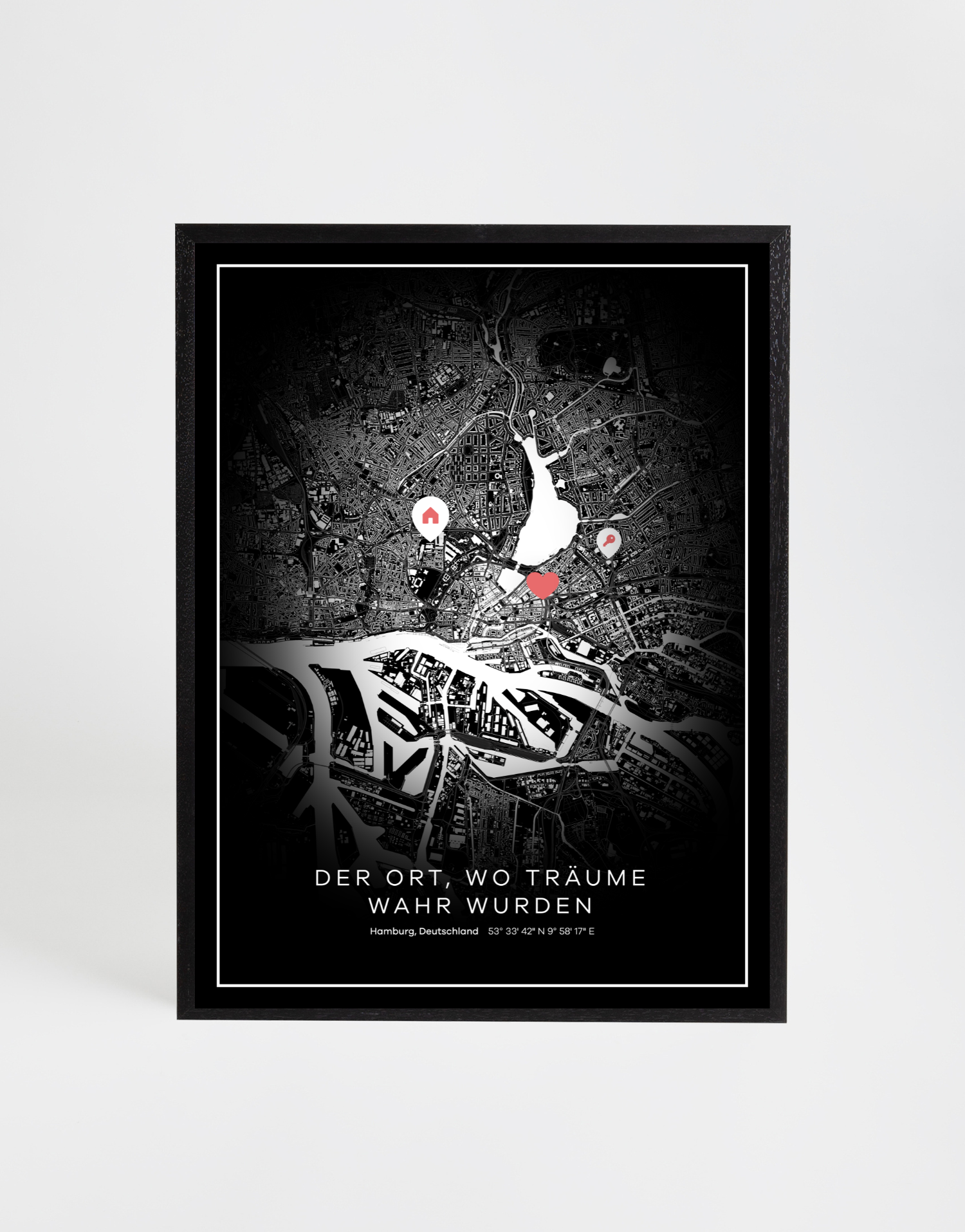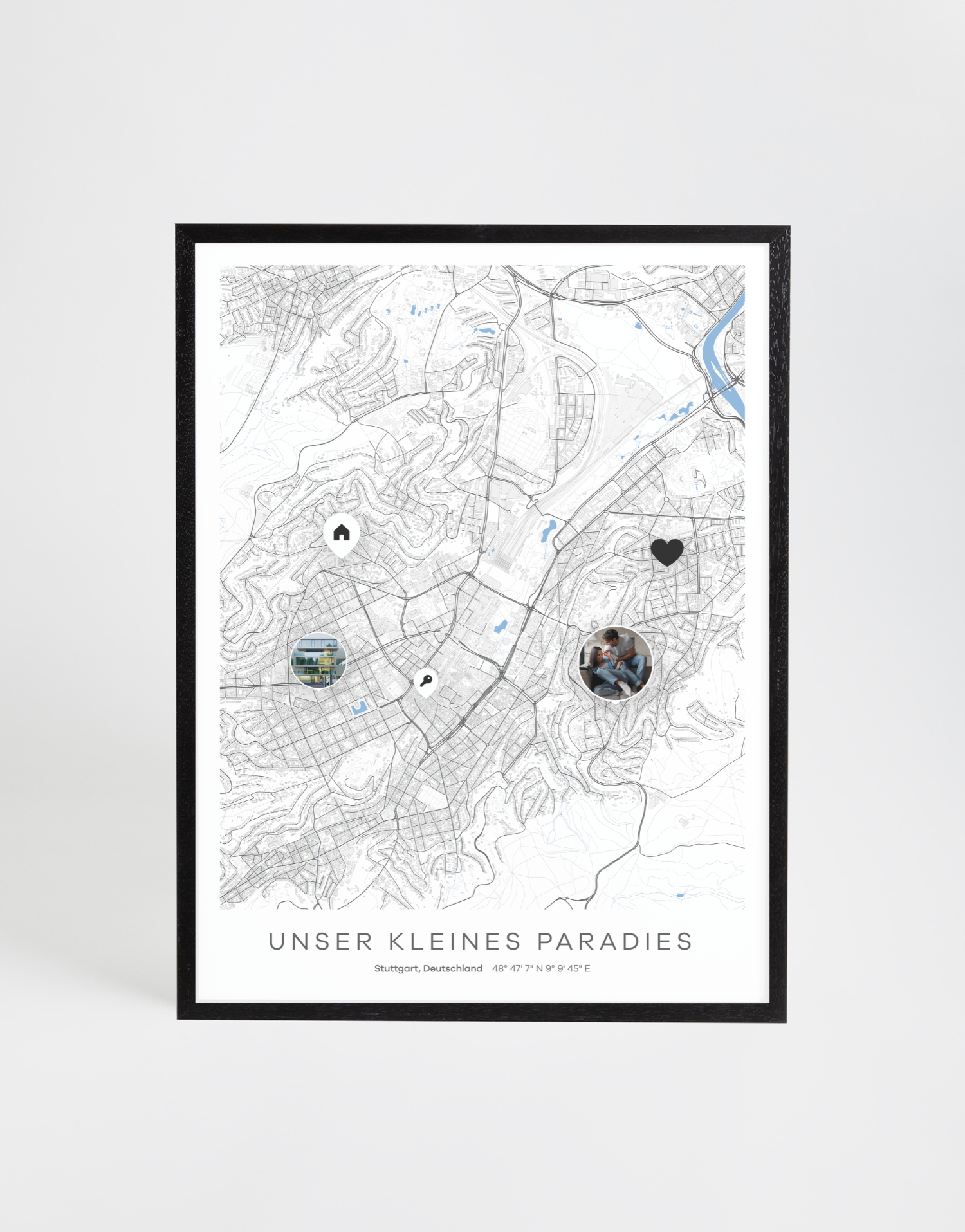 Unsere Stadtkarte ist ein personalisiertes Geschenk, das deine persönliche Geschichte einer Stadt erzählt. Wähle einen bedeutenden Ort aus und verwandle einen Kartenausschnitt in dein individuelles Koordinatenbild: Setze Marker oder Bilder genau an die Orte, die dir wichtig sind, und halte die besonderen Momente fest, die deine Stadt für dich prägen. Unsere Designvorlagen helfen dir, deine Geschichte richtig zum Ausdruck zu bringen — ob als buntes Wandbild oder minimalistisches Poster.