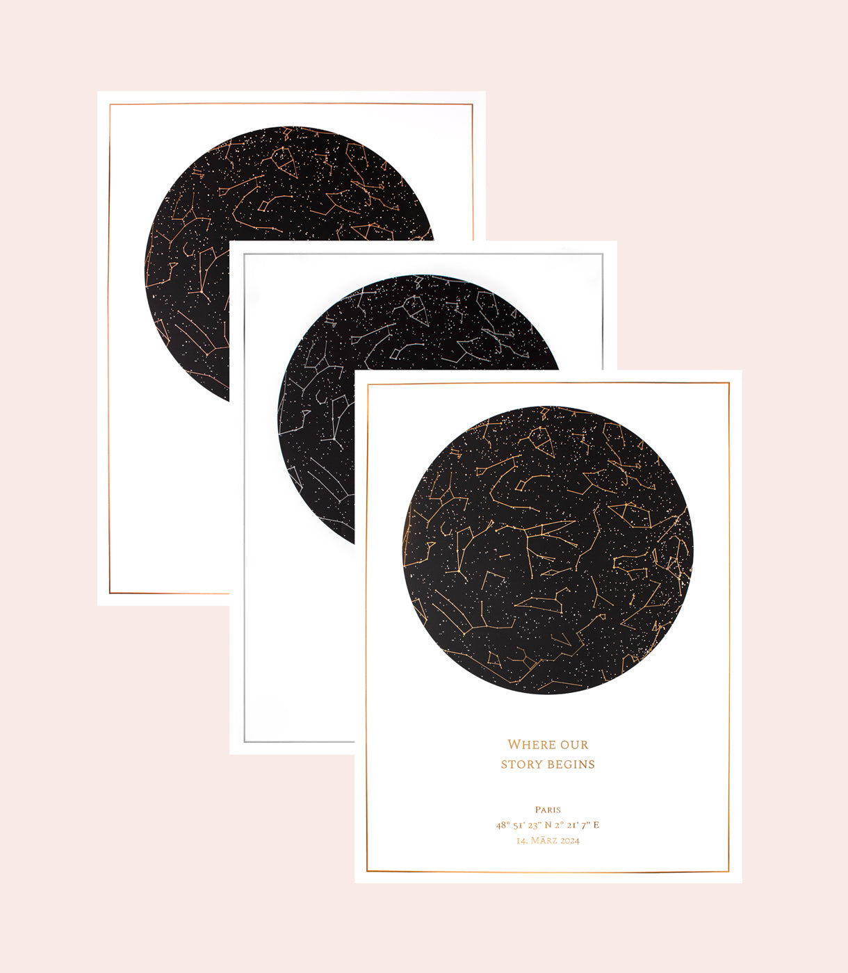 Für den besonderen Wow-Effekt: Sternenkarten mit Glanzfolie veredelt. Wähle zwischen Gold, Silber oder Roségold. Halte einen besonderen Moment fest.
